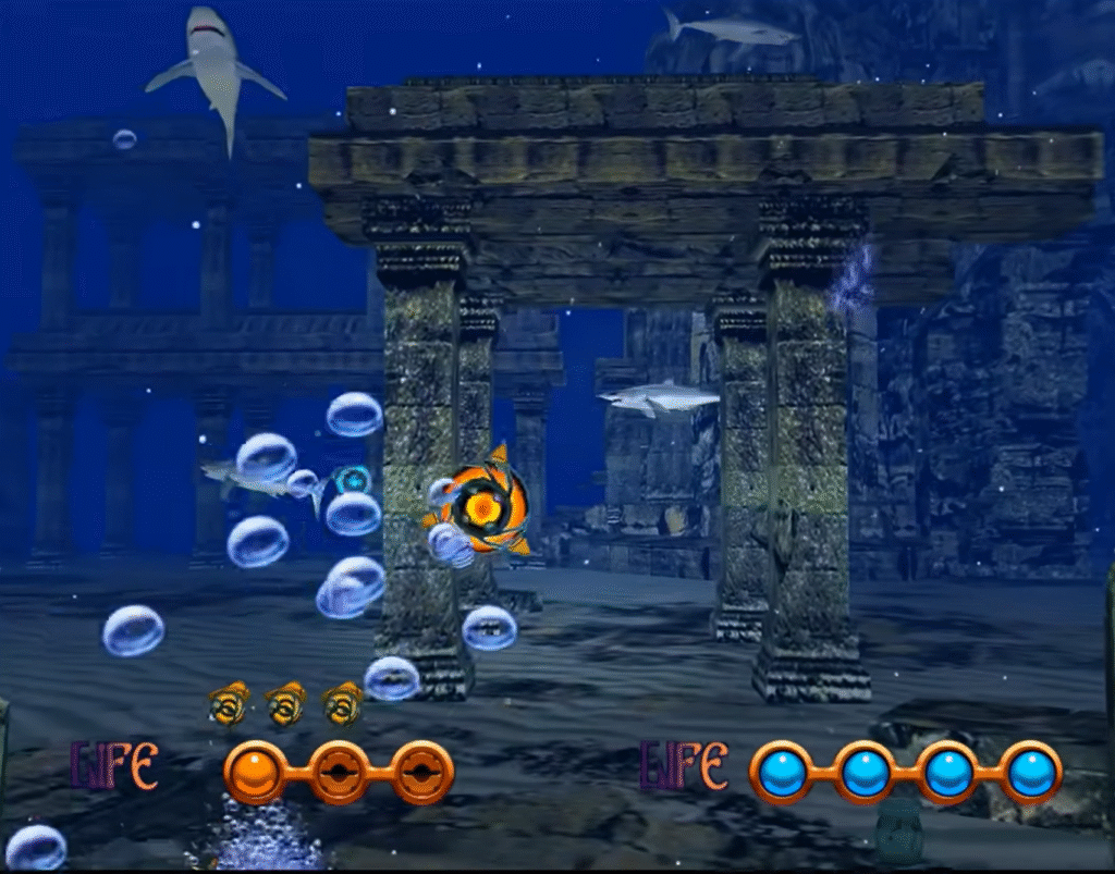 What’s the gist of it? Sega made a lot of light gun games over the years. While The Ocean Hunter is thematically similar to stuff like House of the Dead and Ghost Squad, it has a few noteworthy quirks. For starters, the actual plastic gun peripheral isn’t really a gun at all — it’s this weird, inorganic looking yellow turret that feels more like a steering wheel than a firearm. So it has a very unusual sense of movement for an arcade shooter, but it’s the in-game physics that make The Ocean Hunter feel unlike anything else within its genre. Since the game takes place underwater, your bullets aren’t guaranteed to follow in a straight line and the currents of the ocean can (and will) send your projectiles veering off in directions you didn’t intend. Honestly, I can’t think of another arcade light game that does something like that, and that element of the game alone makes it worth trying out.