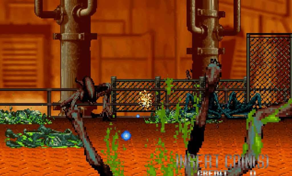 If you’ve played any of Sega’s beloved Jurassic Park arcade shooters, this is pretty much the prototype — albeit, with 100 percent less velociraptors and 100 percent more acid-spewing Xenomorphs with heads shaped like Genesis controllers.